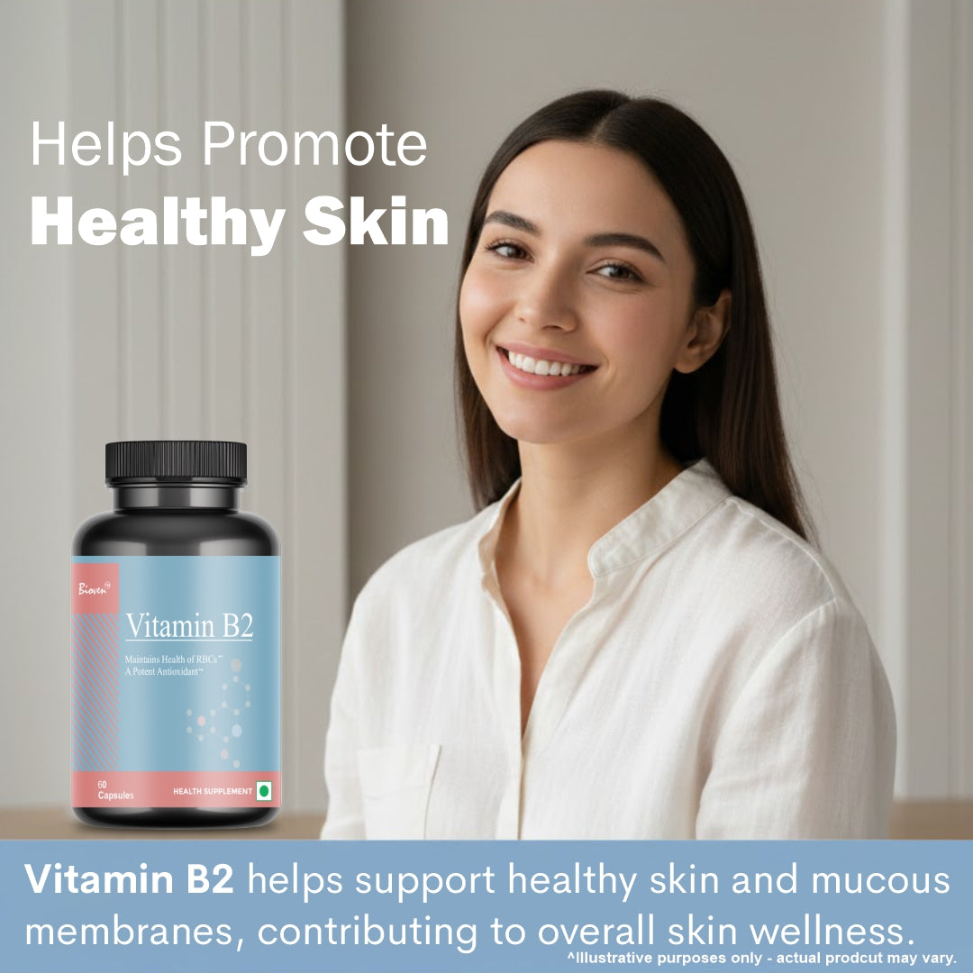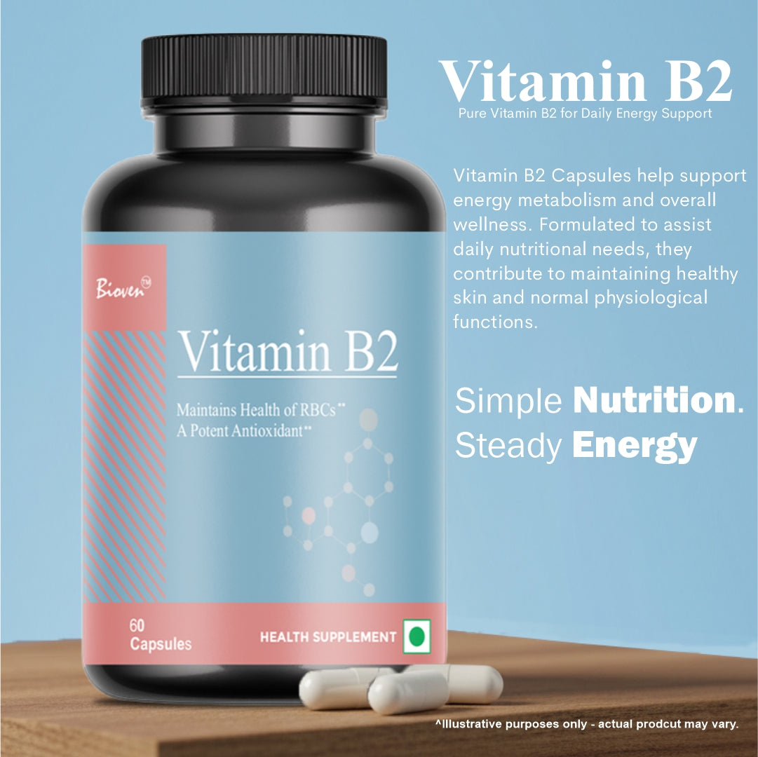 Bioven ビタミンB2(リボフラビン)60ベジカプセルは、エネルギー代謝と健康全般に重要な役割を果たす必須ビタミンB群を配合しています。リボフラビンは、食物を利用可能なエネルギーに変換するのを助けるとともに、神経機能、赤血球の形成、そして健康な皮膚と目のサポートにも役立ちます。定期的に摂取することで、毎日のエネルギーレベル、代謝バランス、そして細胞の健康を維持するのに役立ちます。毎日手軽に摂取できるよう設計されたBioven ビタミンB2カプセルは、毎日のビタミン摂取量と長期的な健康維持をサポートしたい方に最適です。