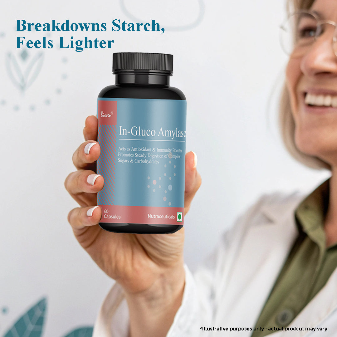 Biovencer In-Gluco Amylase Capsules – Natural Digestive Enzyme Supplement for Carbohydrate Breakdown, Energy & Gut Health – 60 Veg Capsules
