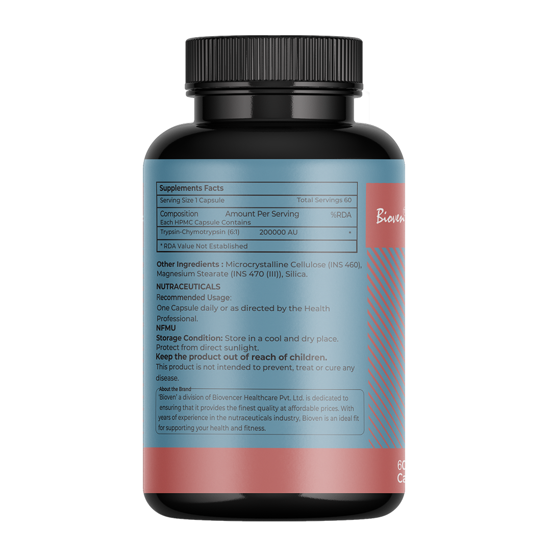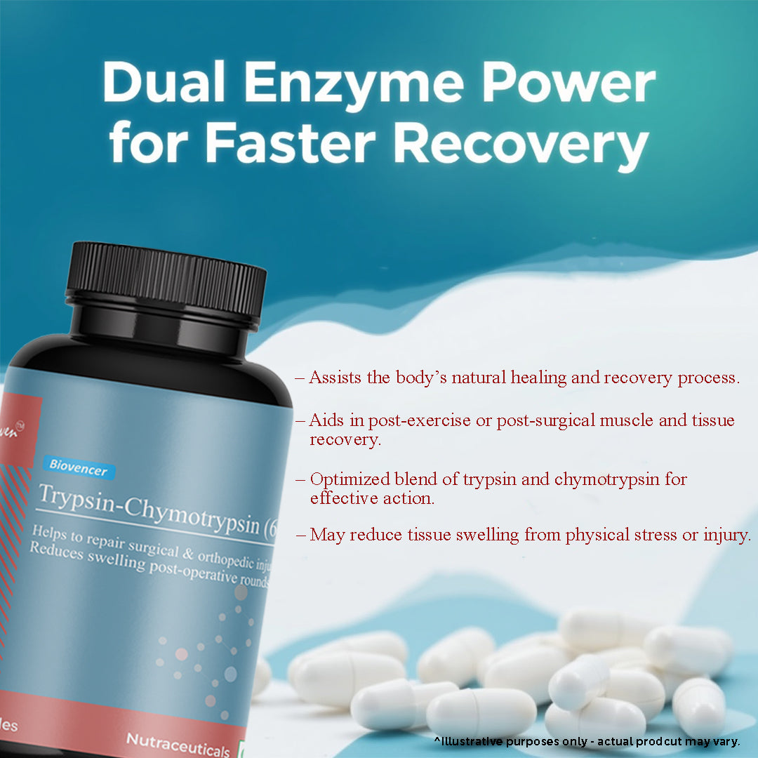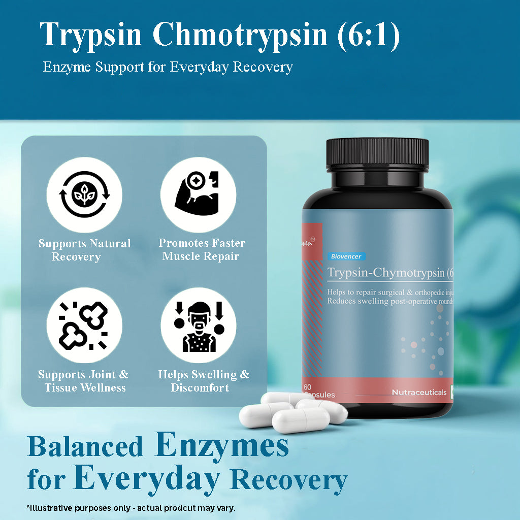 Biovencer Trypsin Chymotrypsin (6:1) Capsules are a scientifically formulated enzyme supplement designed to support inflammation control, pain relief, and tissue recovery. Trypsin and Chymotrypsin are powerful proteolytic enzymes that work together in a precise 6:1 ratio to accelerate healing, reduce swelling, and enhance mobility. Ideal for post-surgical recovery, injury management, and chronic inflammatory conditions, this natural enzyme blend promotes faster healing and supports joint and muscle health. Biovencer ensures high-quality manufacturing standards, delivering safe and effective supplementation for overall wellness.