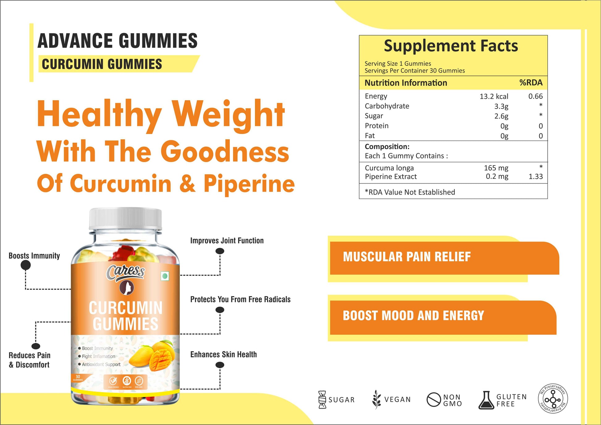 Caress Weight Management with Turmeric Curcumin with piperine. Curcumin Gummies is made with 95% active Curcumin & piperine. Turmeric Curcumin Gummies is known to have anti-inflammatory & Anti-bacterial properties.