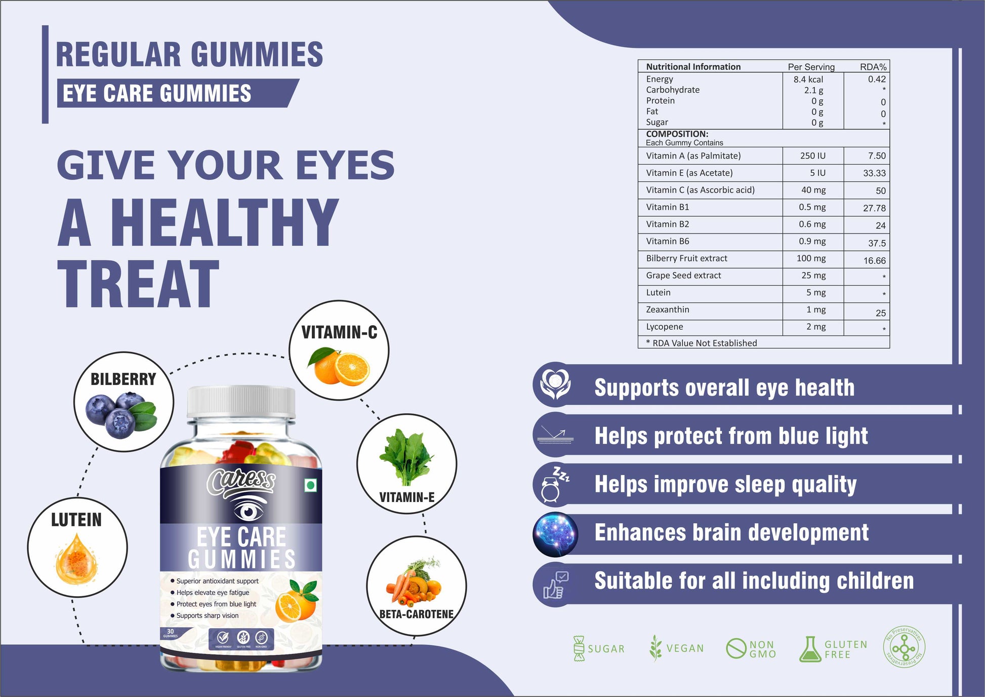 Caress eye care gummies is a vision supplement is enriched with antioxidants Lutein, Zeaxanthin and along with several vitamins like Vitamin C, E, to support lens and retina health, reinforcing your defence against eye degeneration.