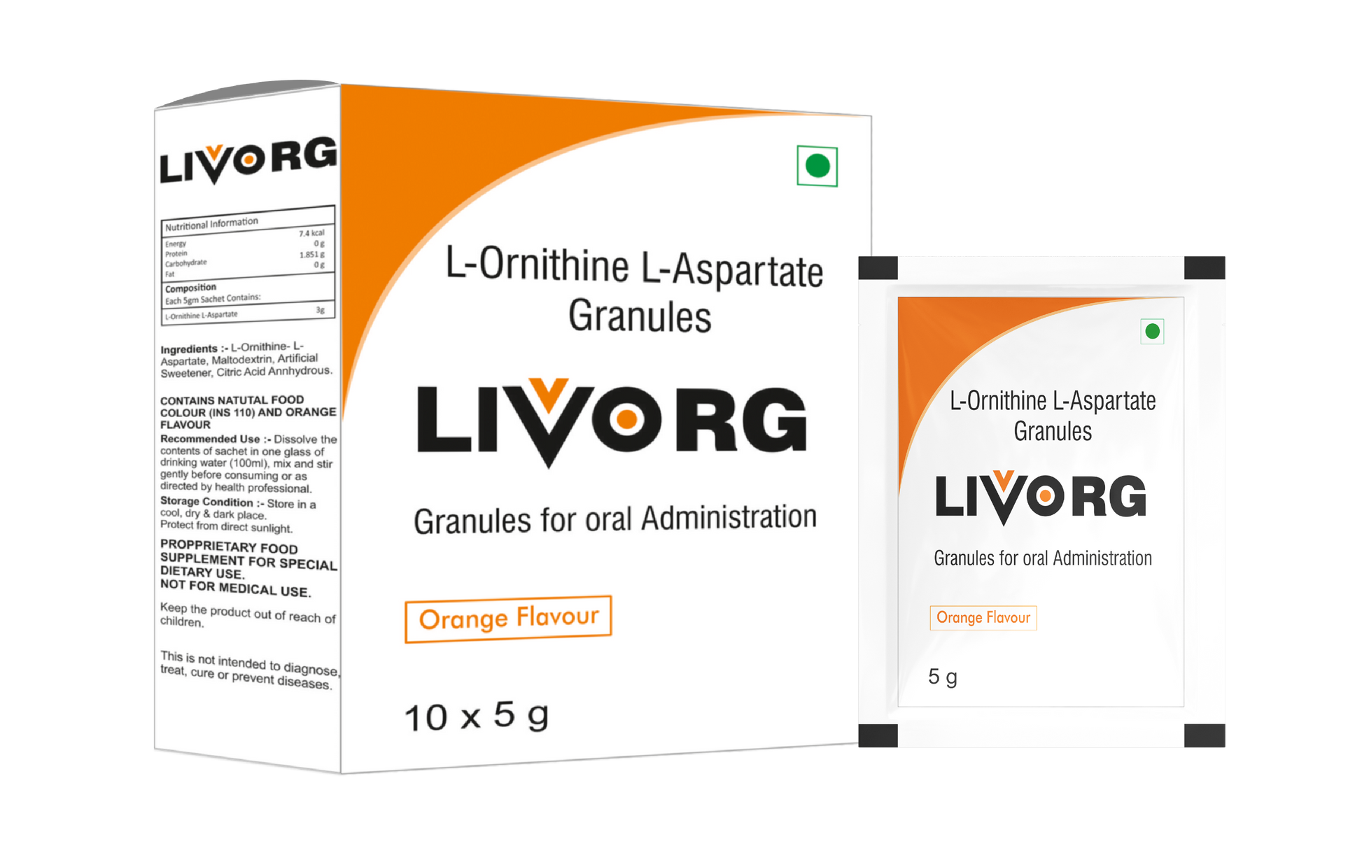 L-Ornithine L-Aspartate Liver Detoxifying Sachet may reduce symptoms of hepatic encephalopathy in people with a liver disease called cirrhosis. L-Ornithine L-Aspartate Granules is a chemical made up of two amino acids ornithine and aspartic acid, liver cleansing sachets. Most amino acids are used as building blocks to make protein. But L-ornithine is not used to make protein supplements for a healthy liver. Instead, it is broken down in the body to provide ornithine and aspartic (LOLA Sachets) acid. L-ornithine increases the levels of ornithine and aspartic amino acid in the body. These LIV-ORG (L-Ornithine L-Aspartate) amino acids help to reduce levels of a toxic chemical called ammonia in the blood.